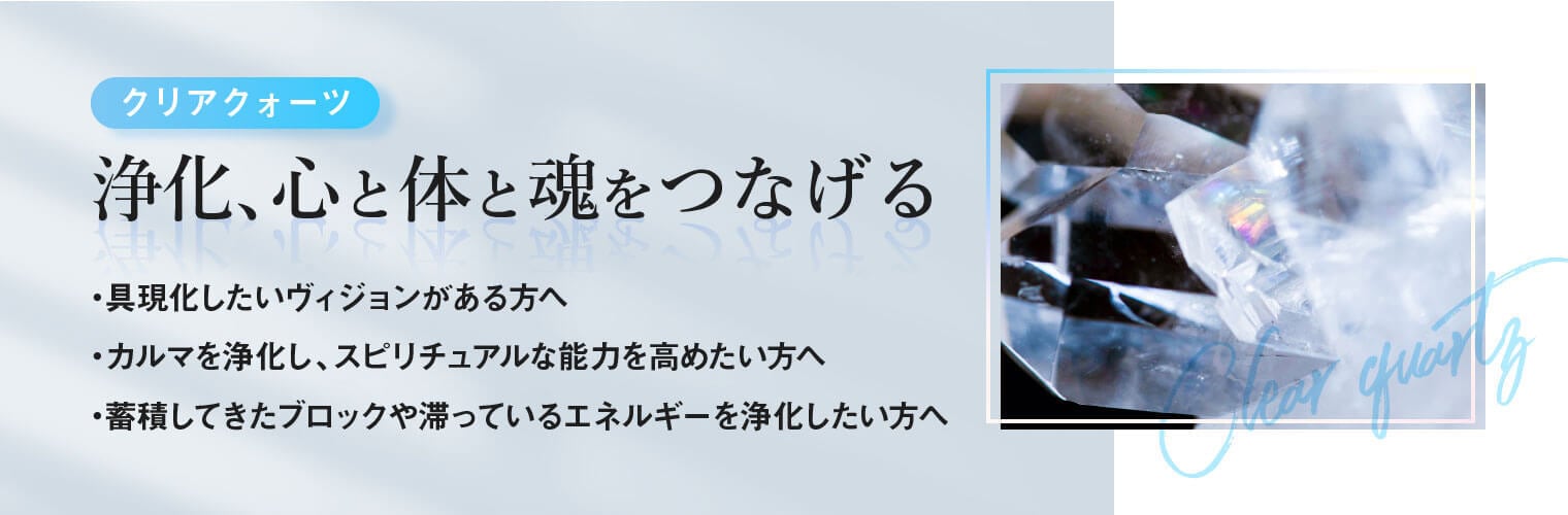 クリアクォーツは全てのチャクラと繋がり浄化する働きがあるため、マスターヒーラーとも呼ばれています。特にクラウンチャクラを活性化し高次の意識と繋がることを助けます。心を開かせ、ネガティヴな思考をより悟りの意識へと近づけてくれます。また、クリアクォーツは神経のバランスを整え、心と体と魂を繋げてくれます。